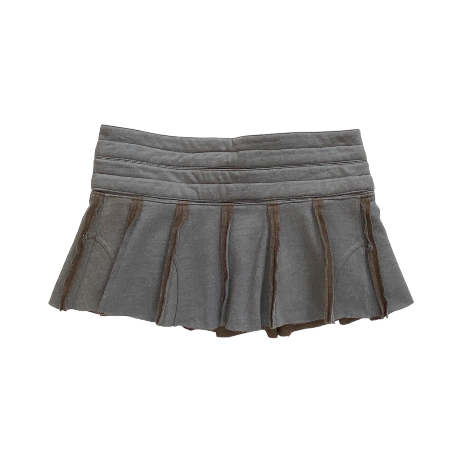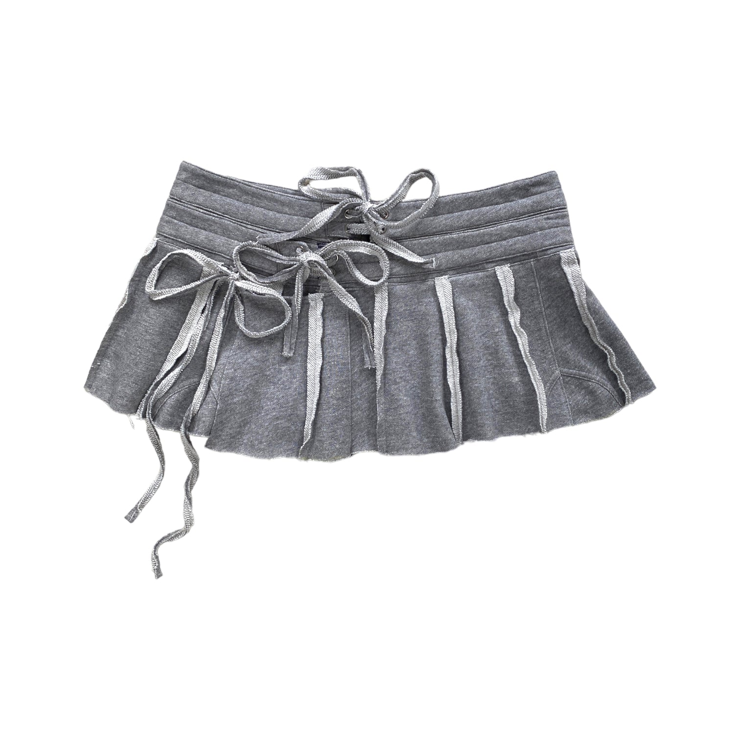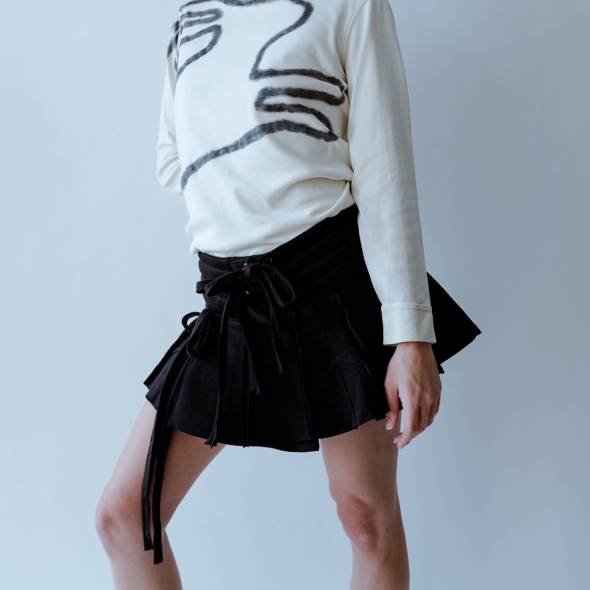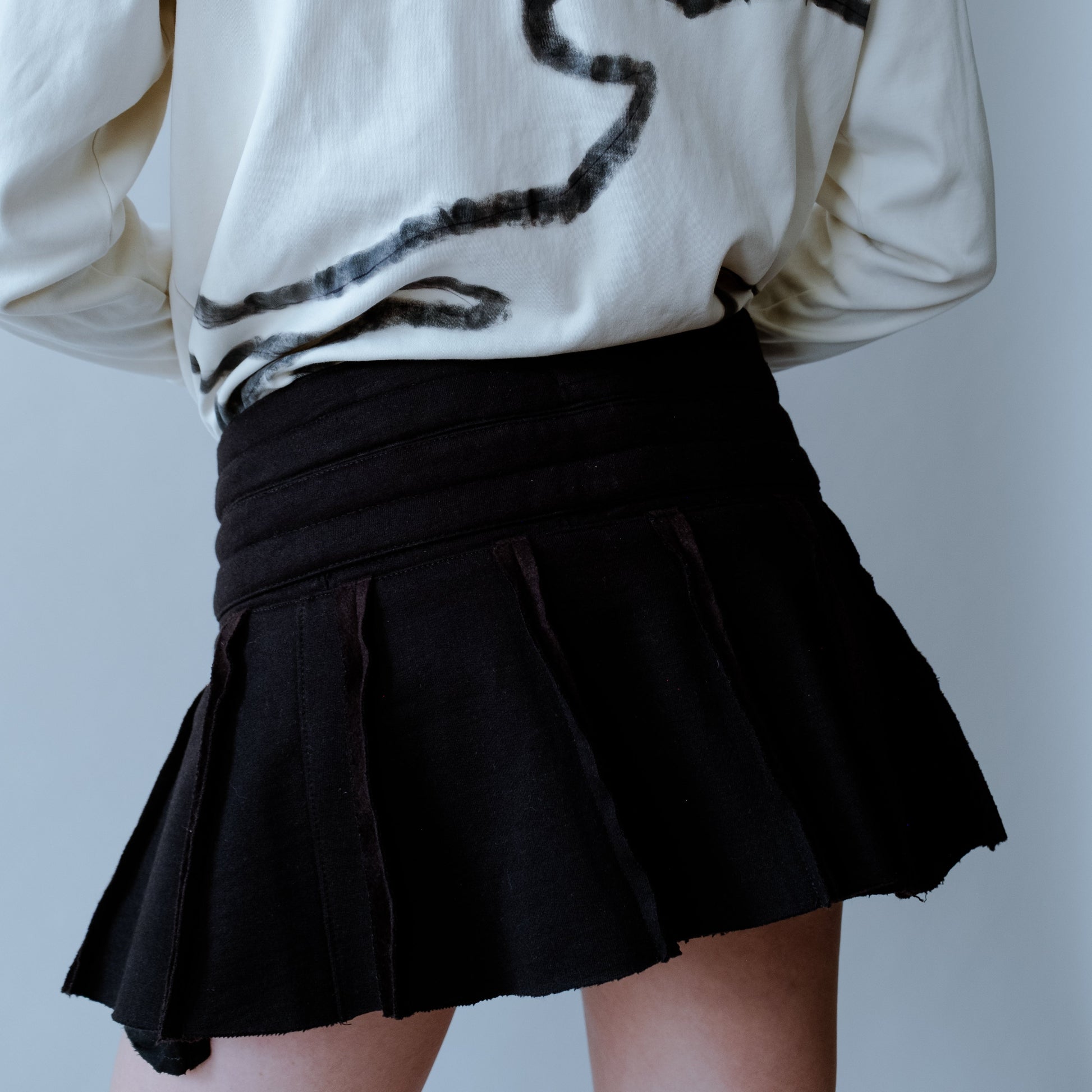 To reduce emissions and make use of what already exists, we are transforming sweatpants from a shuddered men's luxury sporting brand into these adjustable, micro-minis. These flirty and athletic skirts are made from high-quality heavyweight fabric that's remarkably soft. The skirts can be opened fully and wrap to fit a wide range of body shapes and sizes. The unique double waistband (made from two pairs of pants) has two drawstring closures and a third drawstring to close the wrapped skirt panels provides size adjustability and a pleated, layered look. The skirts have hidden pockets underneath the pleats to keep your items stealthily safe, two on the front and one on the back.