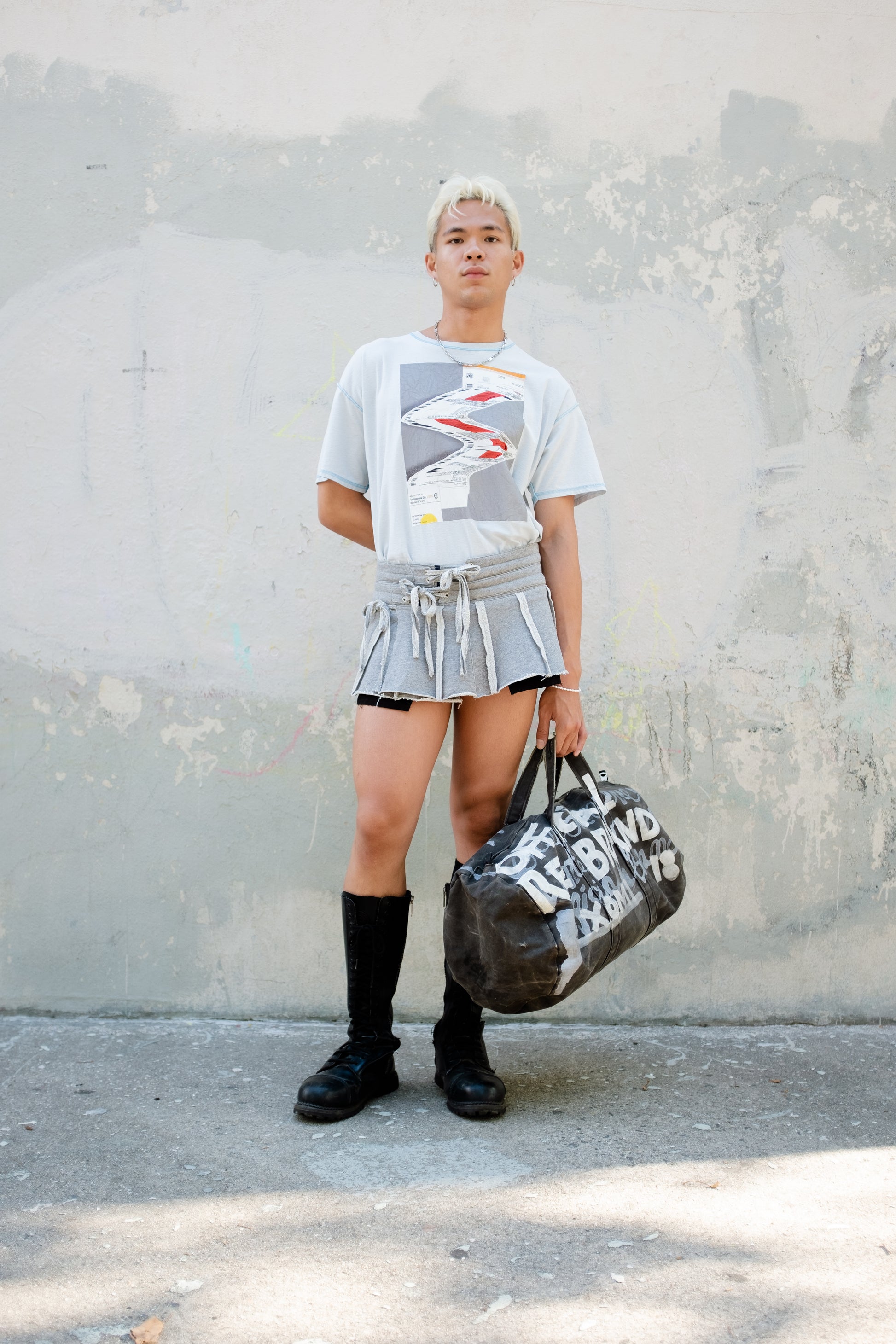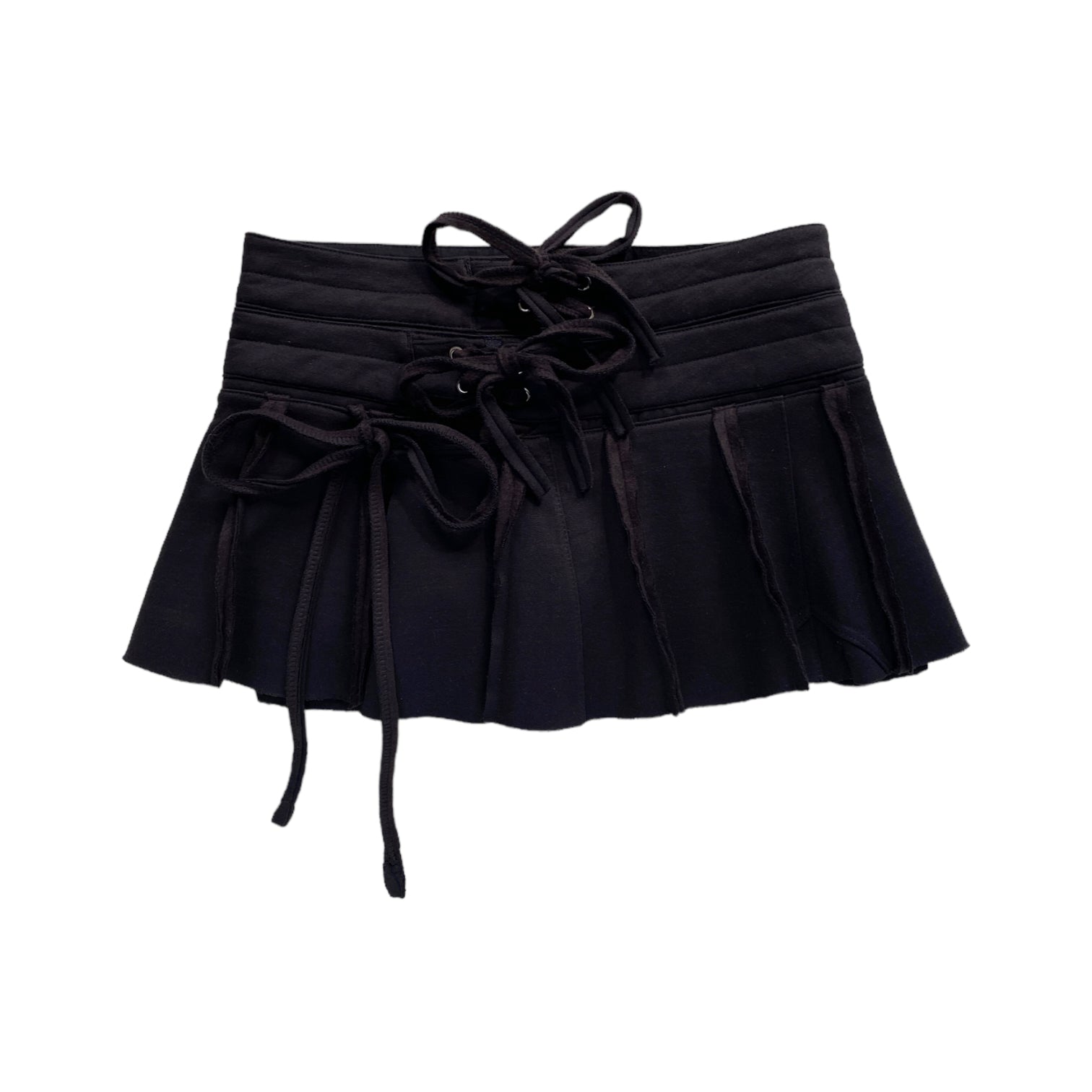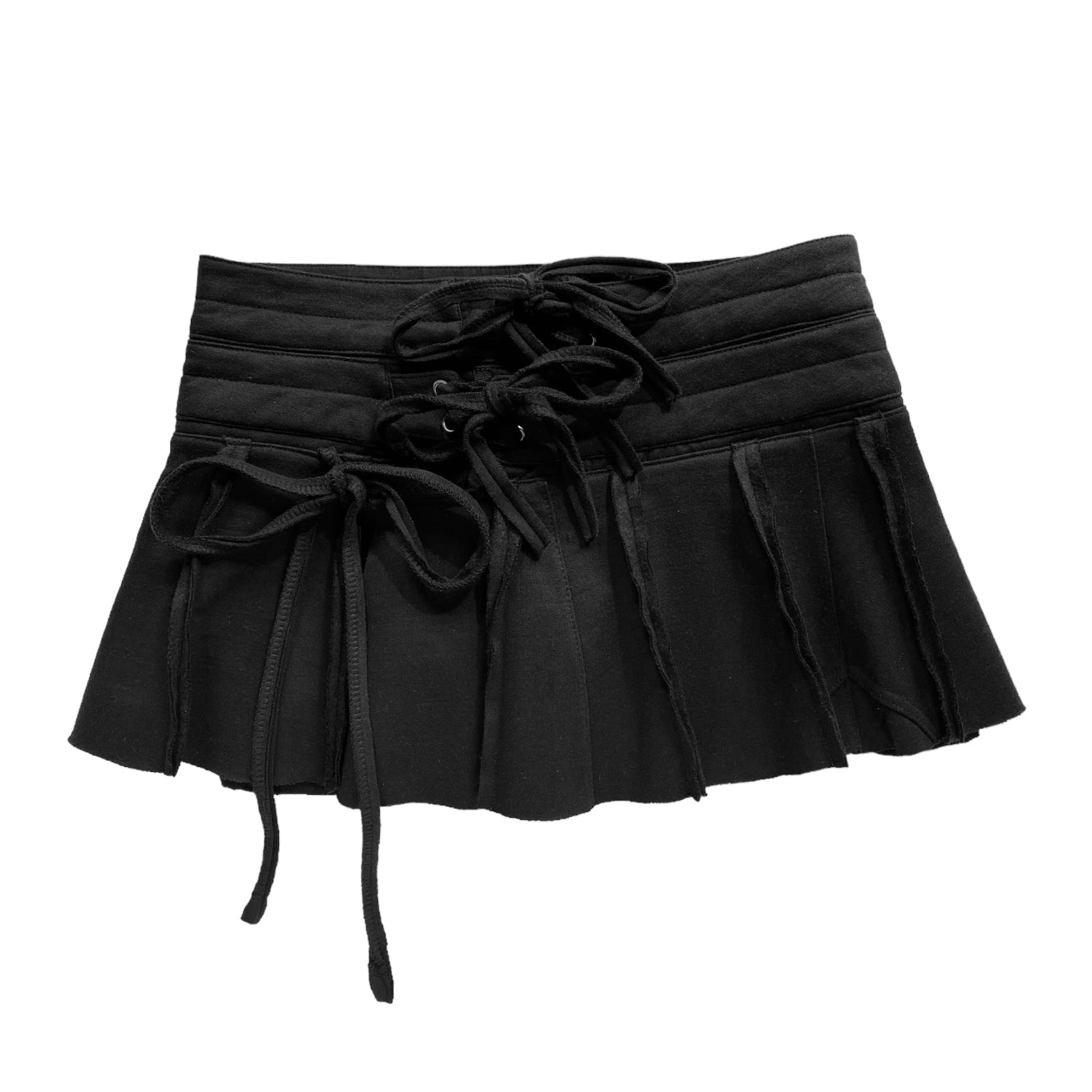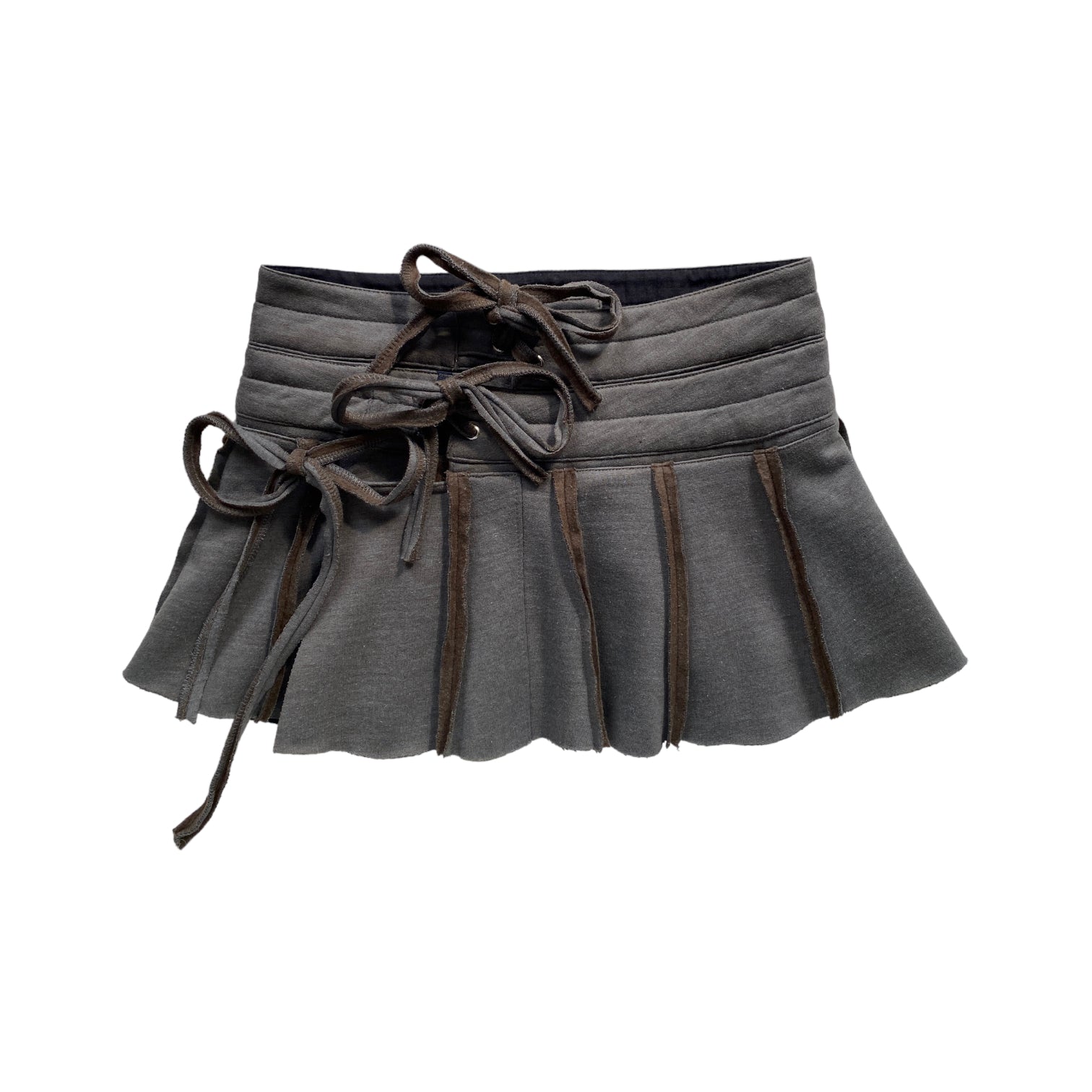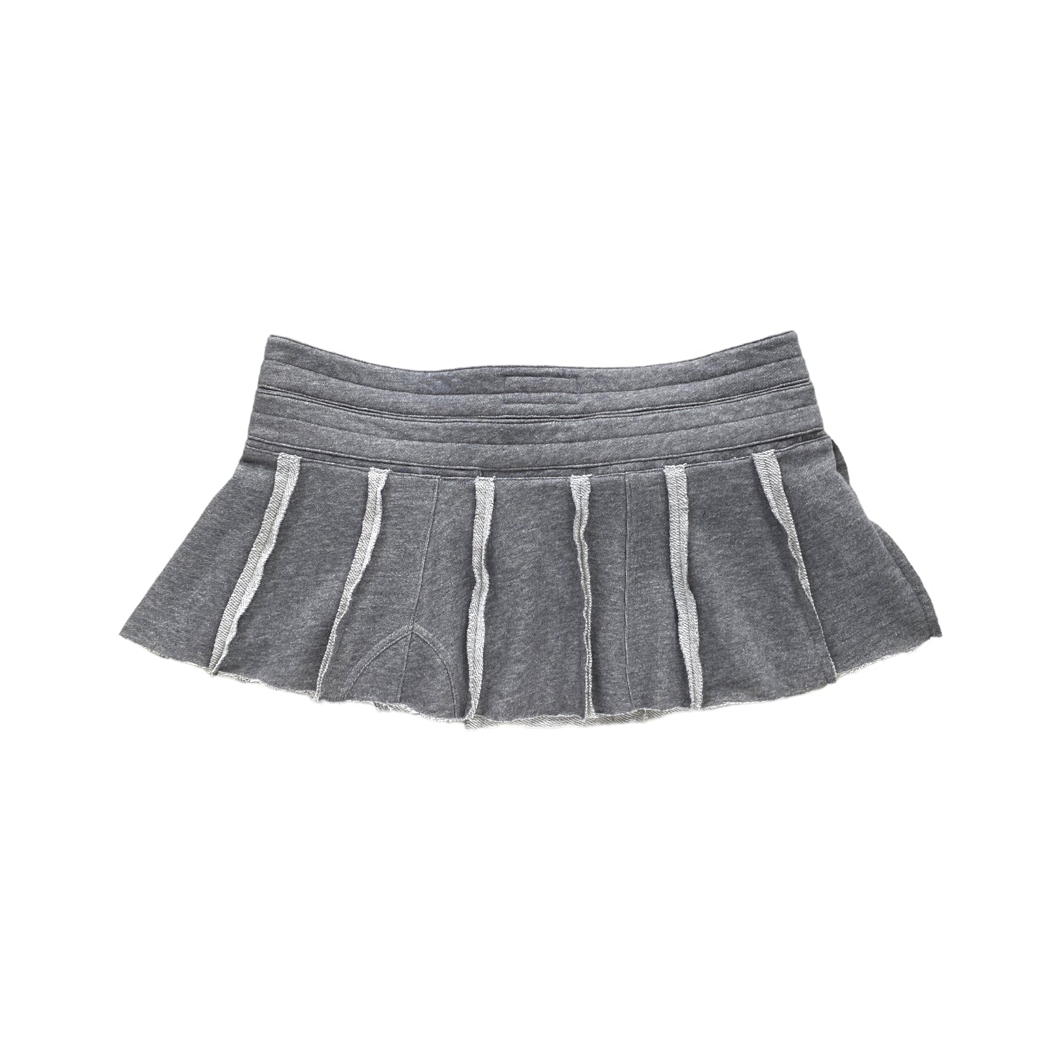 To reduce emissions and make use of what already exists, we are transforming sweatpants from a shuddered men's luxury sporting brand into these adjustable, micro-minis. These flirty and athletic skirts are made from high-quality heavyweight fabric that's remarkably soft. The skirts can be opened fully and wrap to fit a wide range of body shapes and sizes. The unique double waistband (made from two pairs of pants) has two drawstring closures and a third drawstring to close the wrapped skirt panels provides size adjustability and a pleated, layered look. The skirts have hidden pockets underneath the pleats to keep your items stealthily safe, two on the front and one on the back.