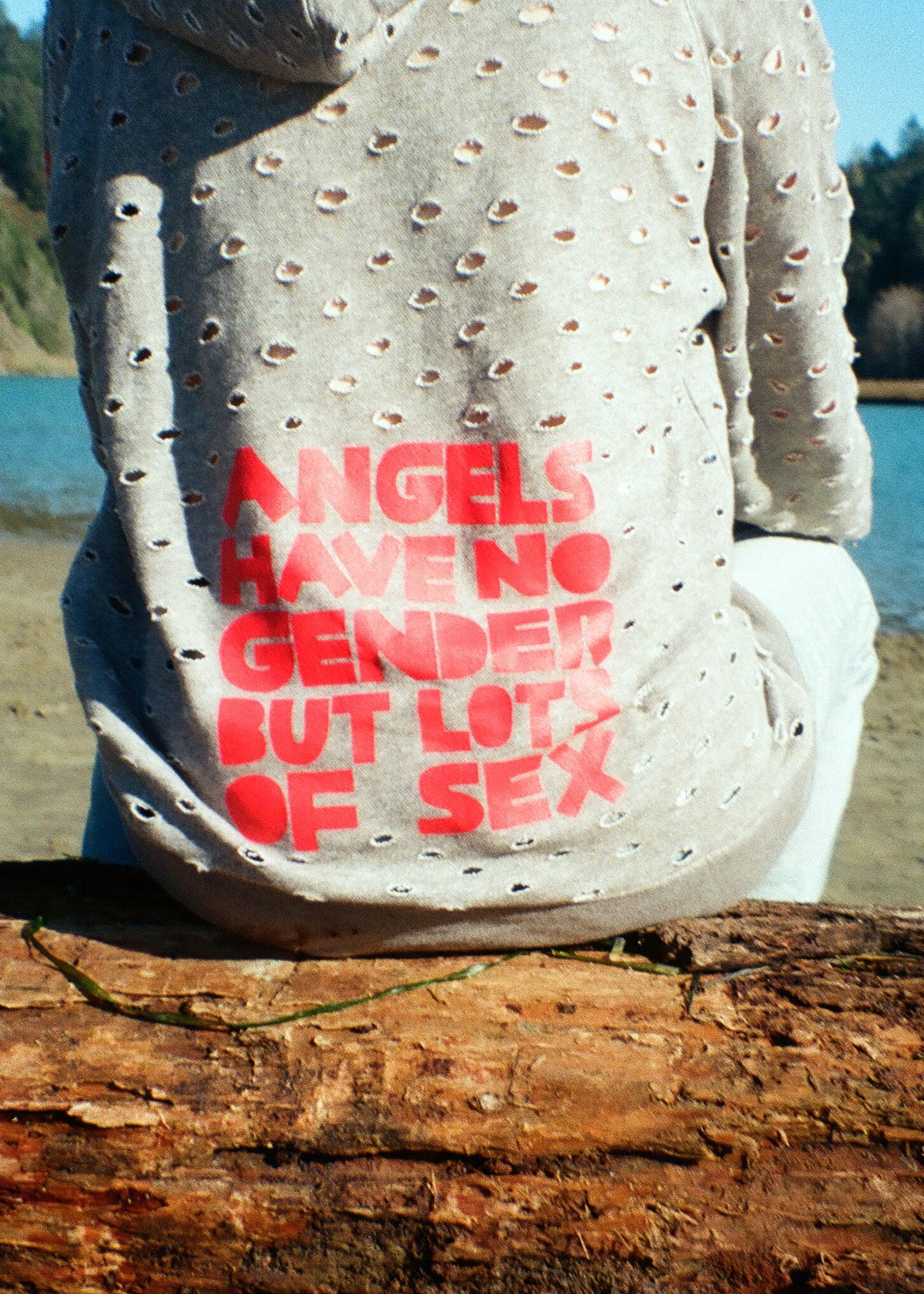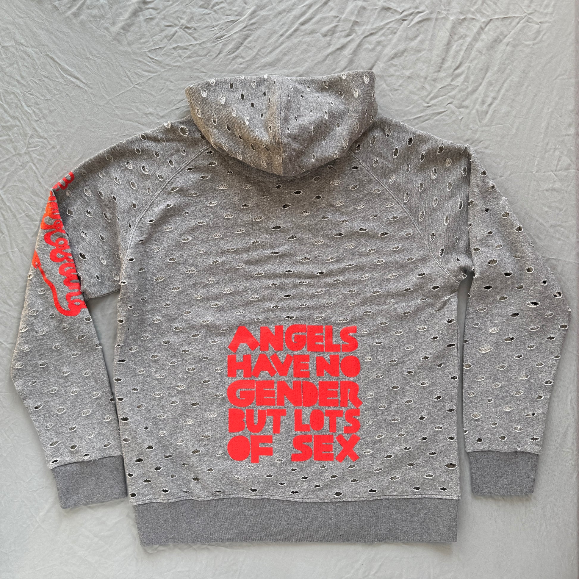 An Official Rebrand Archive classic, with a new twist by Wear and Tear. Bright red text reading "ANGELS HAVE NO GENDER BUT LOTS OF SEX" on the back of lightweight heather grey deadstock jackets from a luxury sportswear brand.