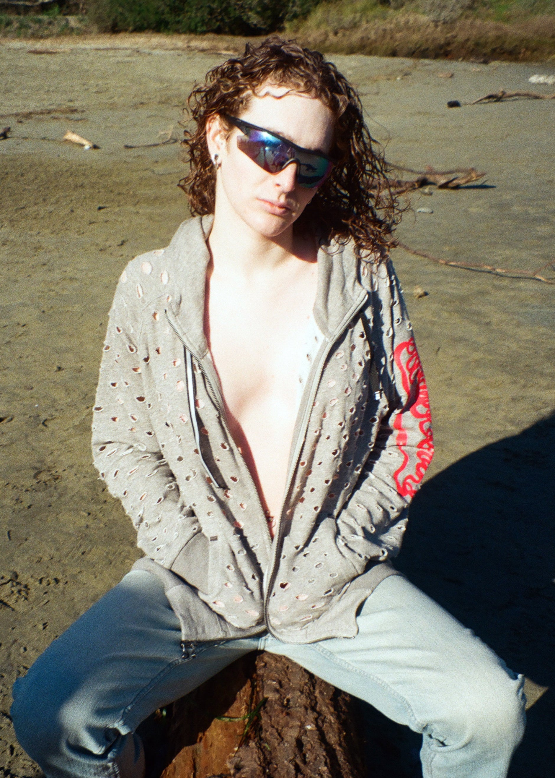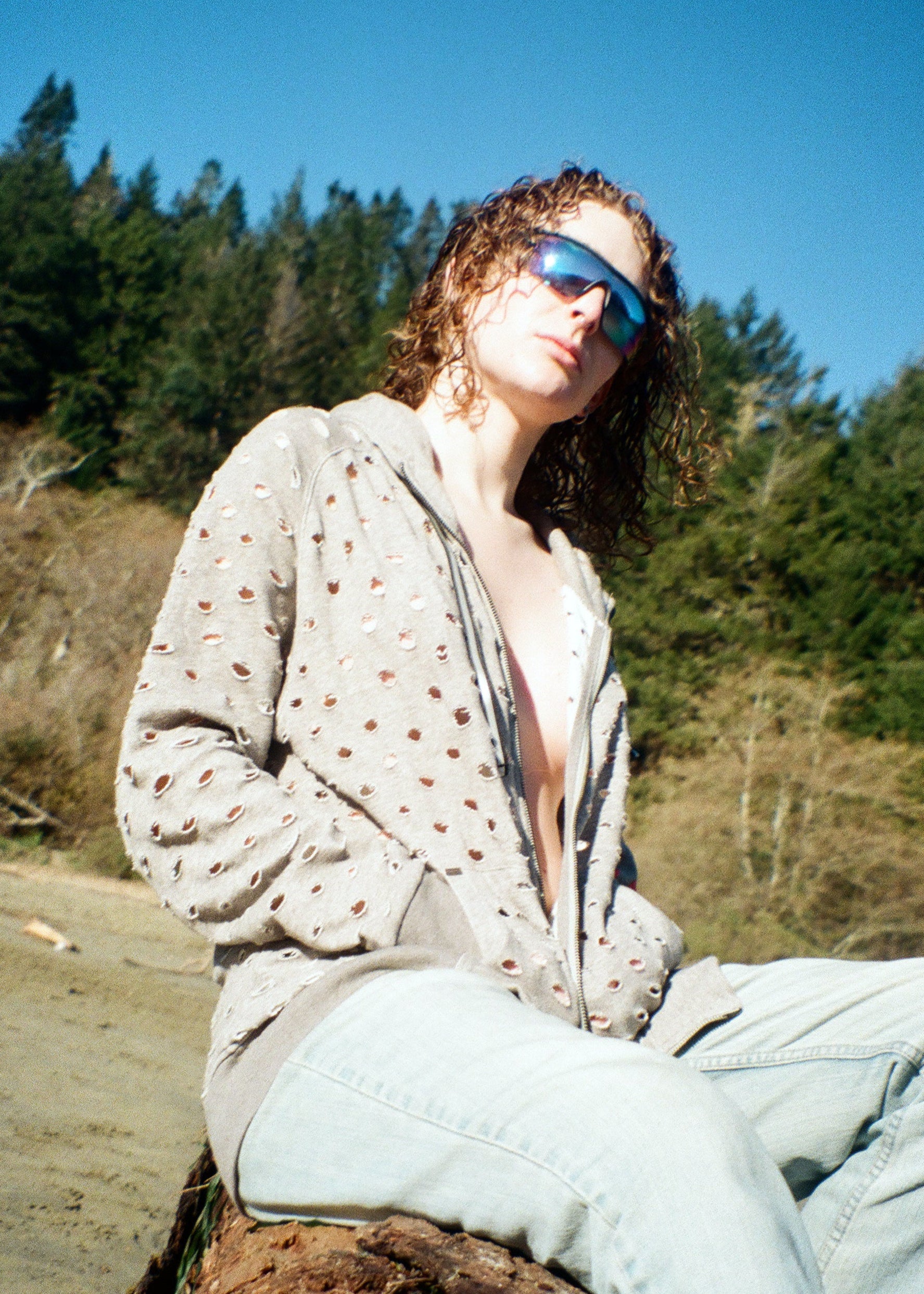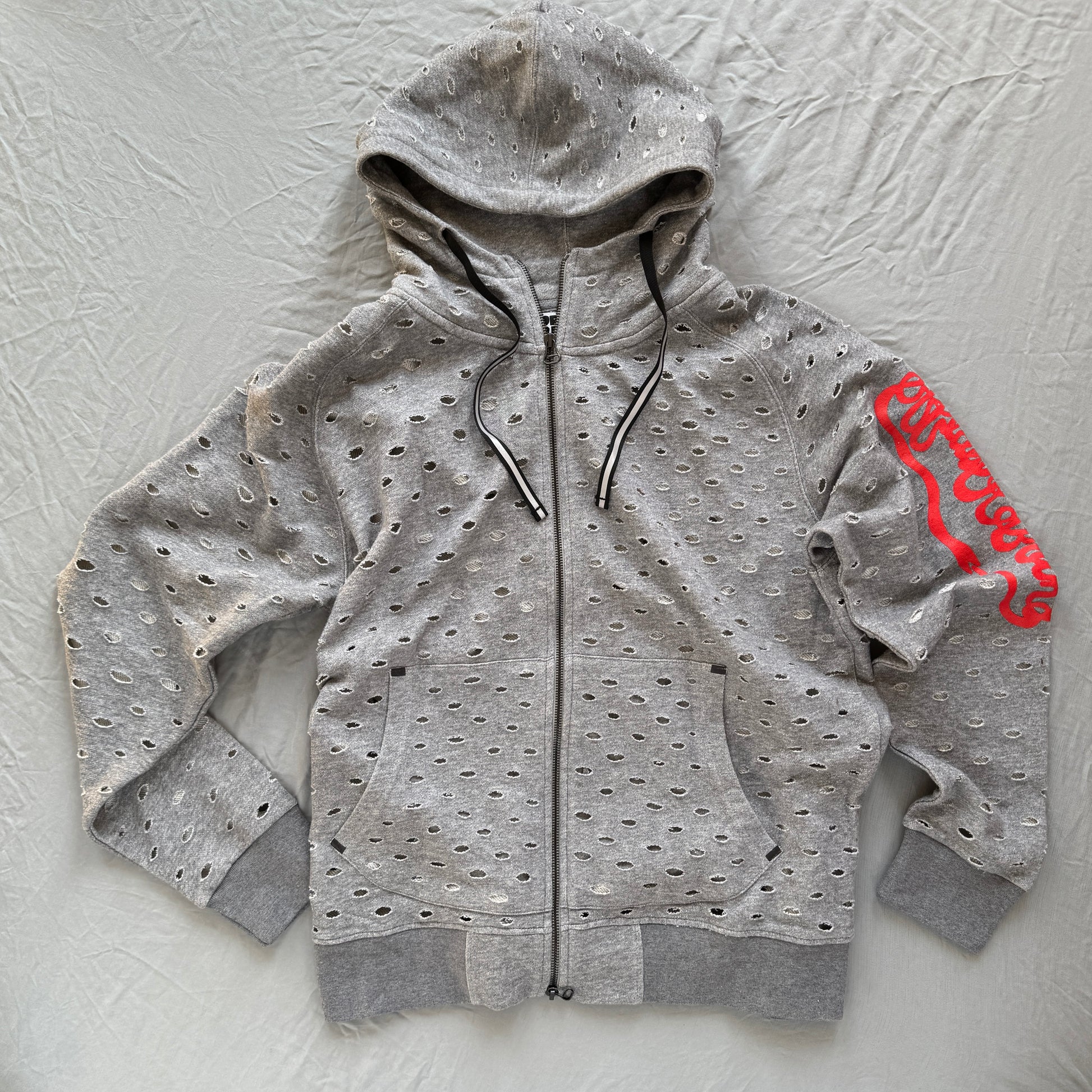 Covered with hand-cut holes done by Wear and Tear. By upcycling second-hand garments, Wear and Tear throws a wrench into the fashion system that demands hyper-consumerism. The garments evolve with every day use. More use begets more love.