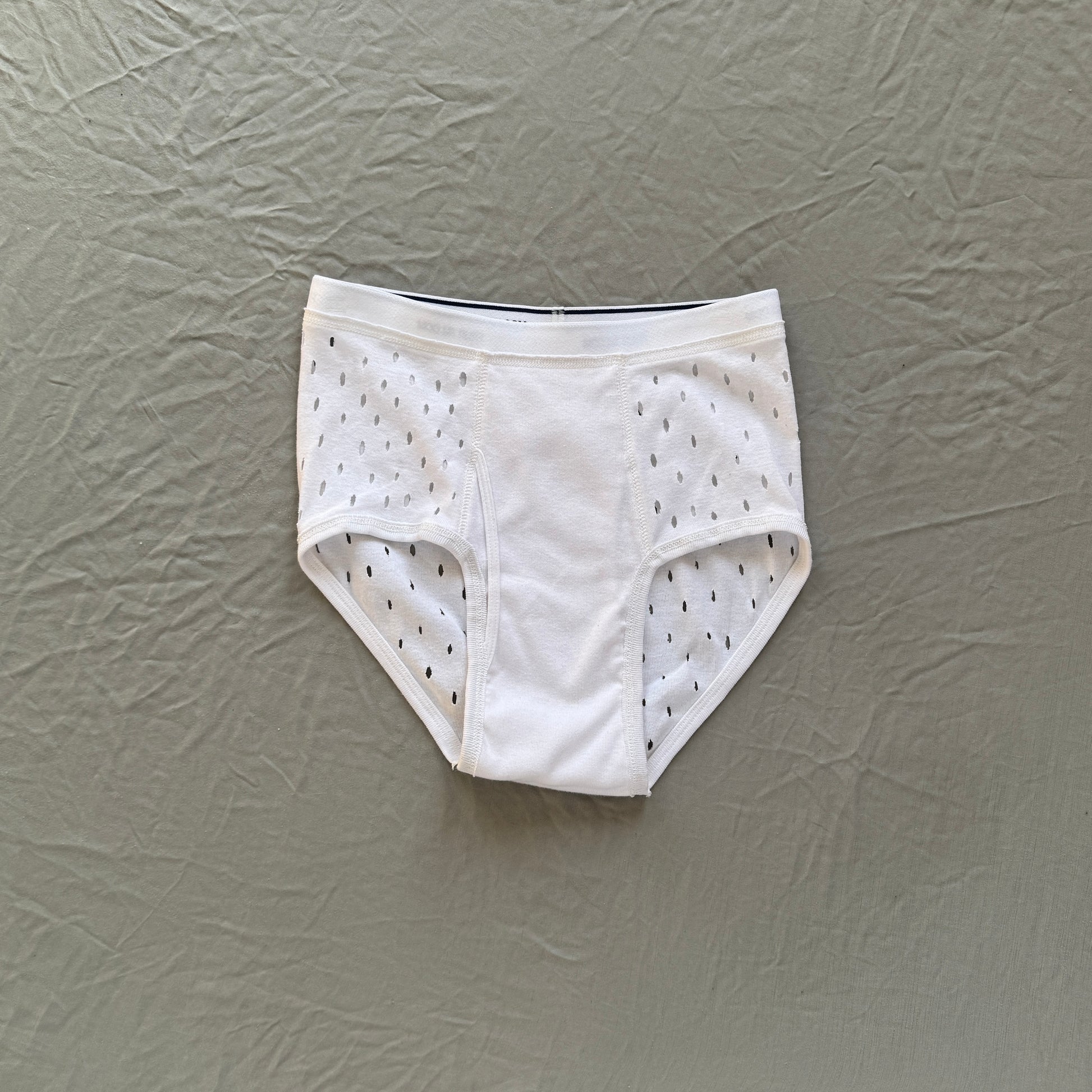 Unlike the majority of our products, these soft and moisture-wicking briefs are not upcycled, but they are made-to-order so there is absolutely no waste. We turn them inside out to get an unbranded blank canvas and print them by hand in limited batches. Then, Wear and Tear adds the small slit holes throughout the design, with love and without excess. While we have a size medium on hand for immediate shipment, if you would like an alternate size, please allow up to two weeks for the creation of your unique product.