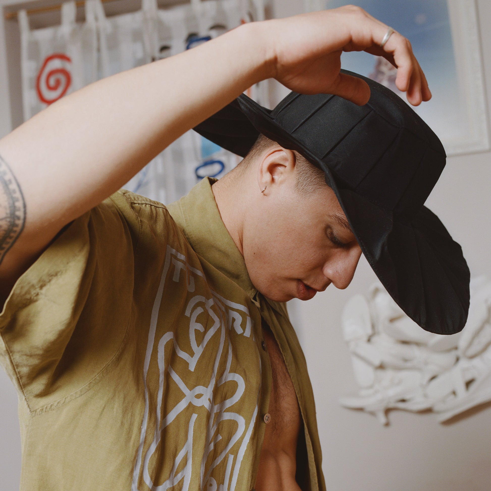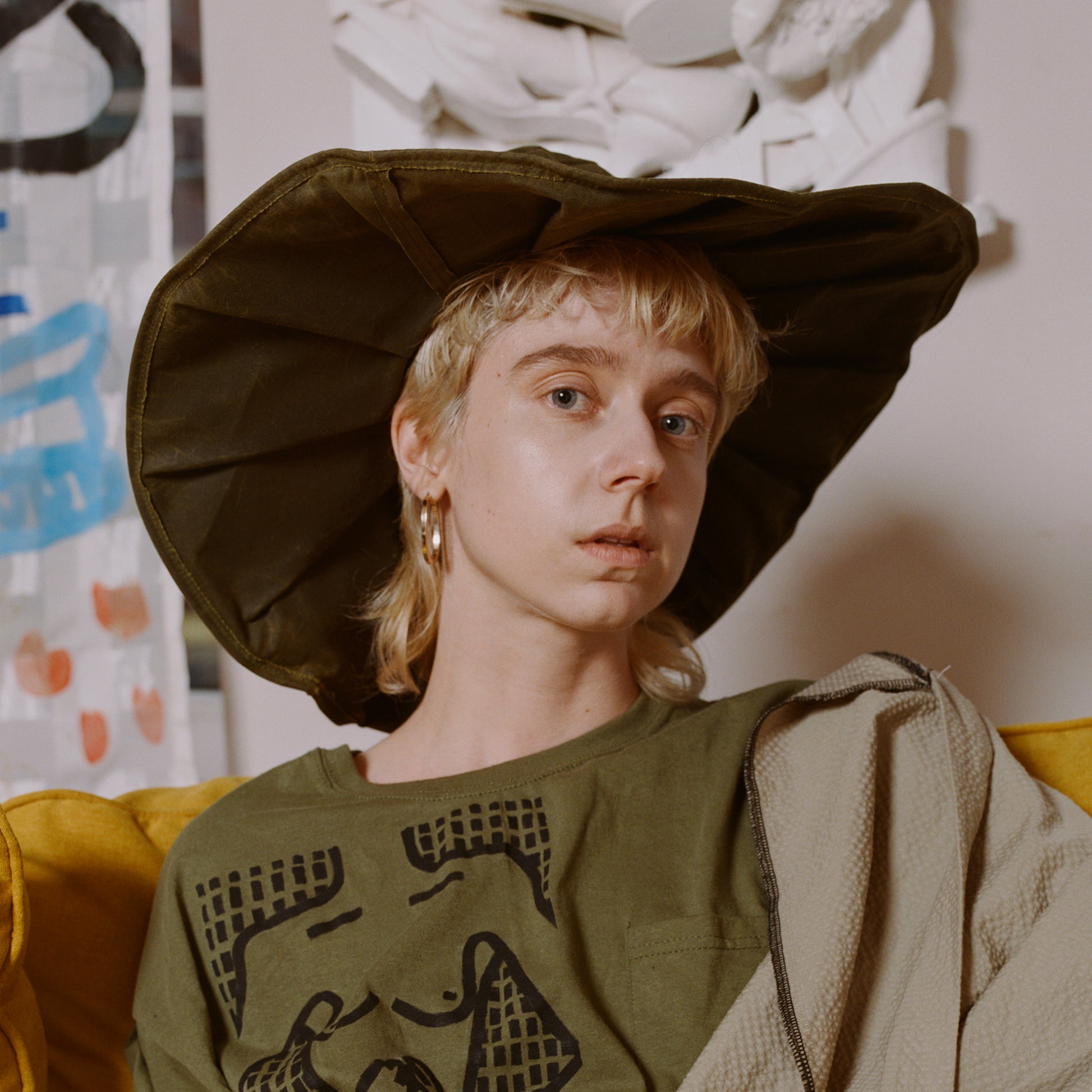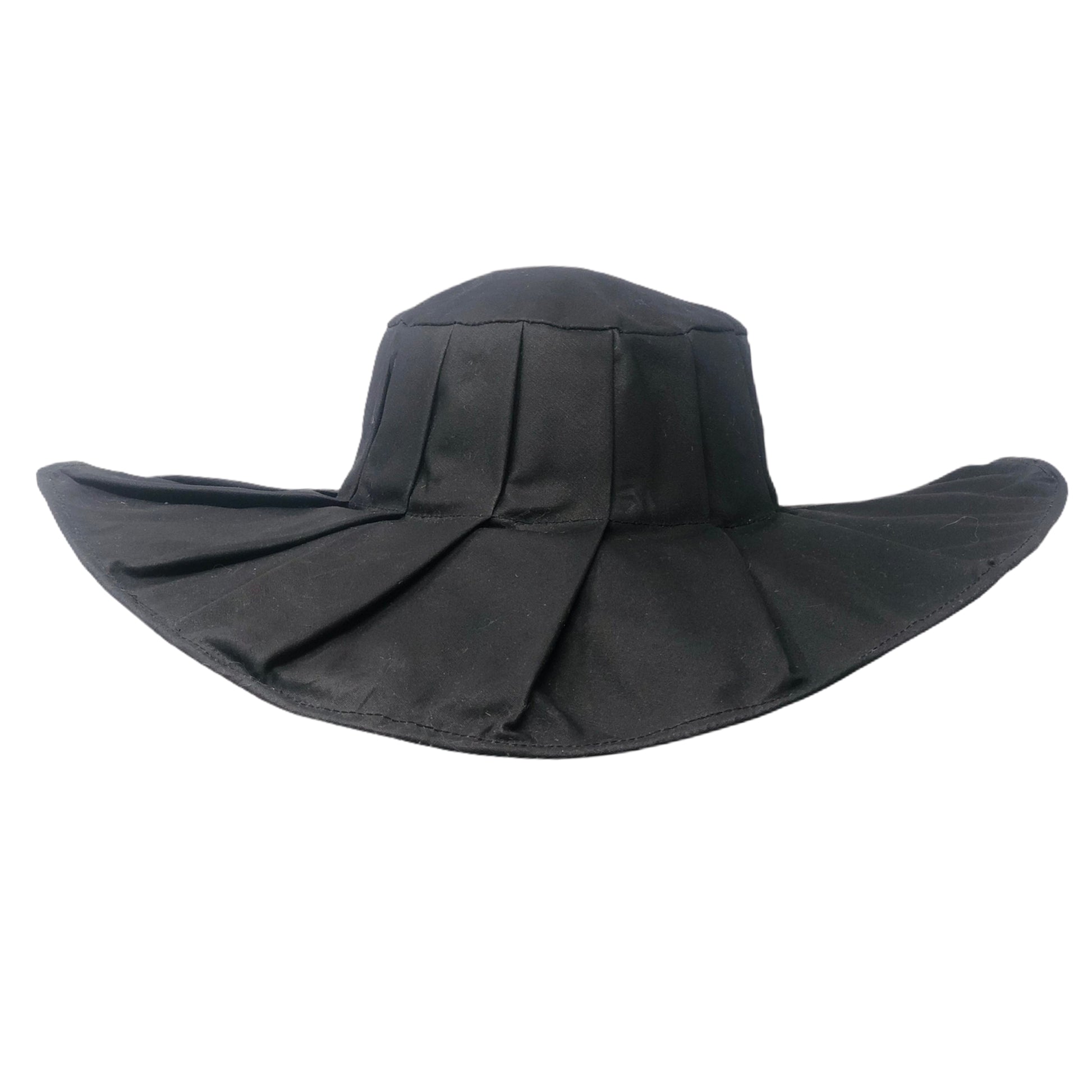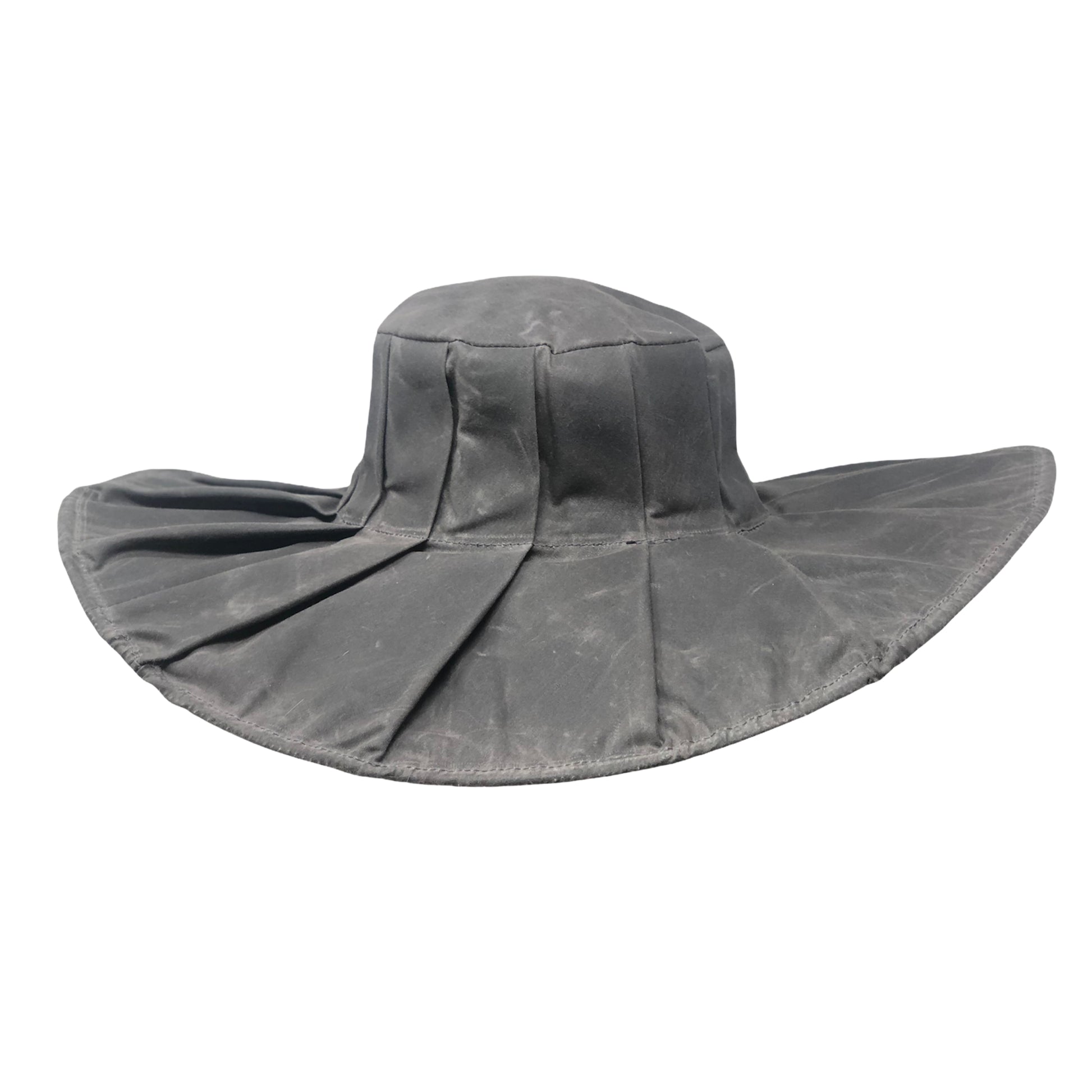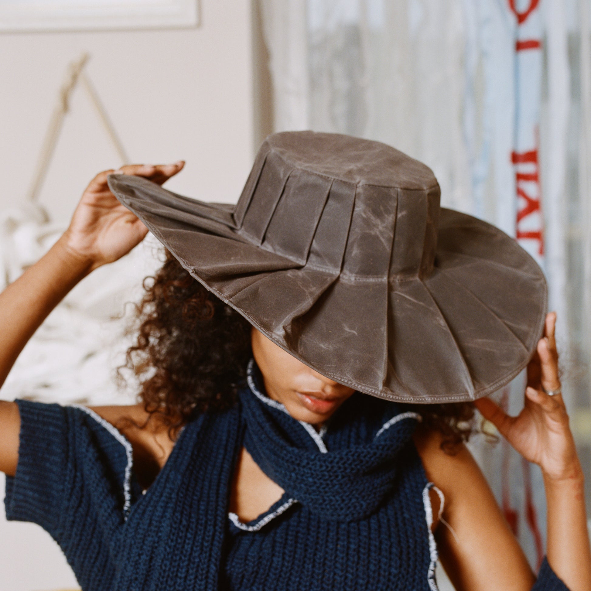 Pleated waxed cotton draped and sewn to create a wide brimmed bucket hat shape inspired by pleated face masks. The wide brim and sturdy material creates a water resistant/sunblocking shelter for the wearer.
